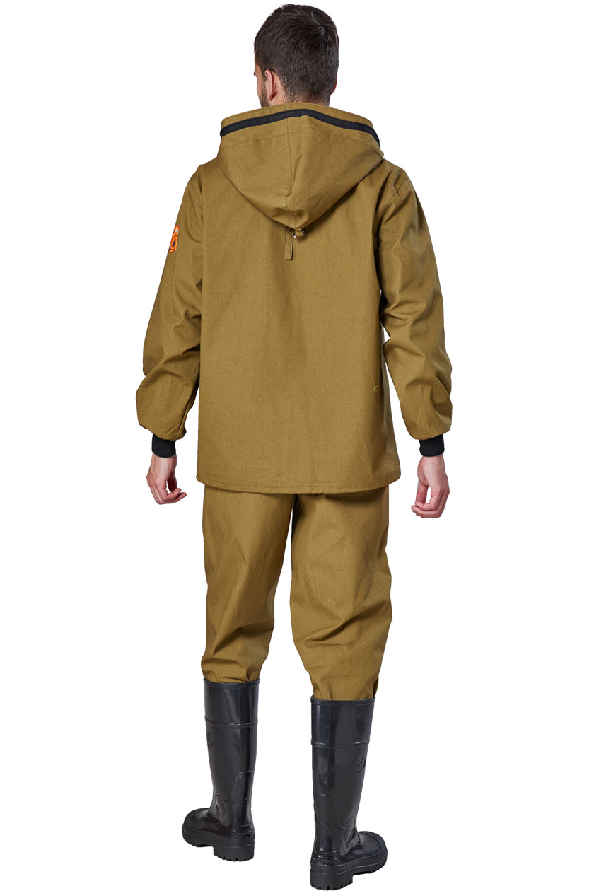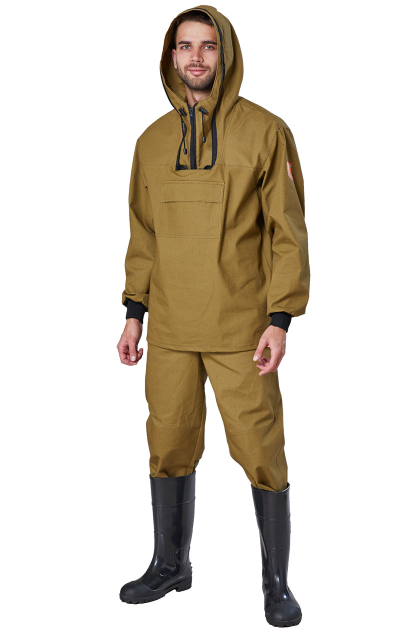 ➠ Куртка прямого силуэта с отрезными кокетками полочки, с капюшоном сложной конструкции, исключающей проникновение насекомых под одежду. Капюшон с противомоскитной сеткой. Низ куртки стягивается эластичным шнуром с фиксатором. Рукава втачные, с трикотажными манжетами-напульсниками. Полочка с накладным карманом с клапаном. В шве притачивания капюшона к полочке выполнен внутренний карман для противомоскитной сетки.