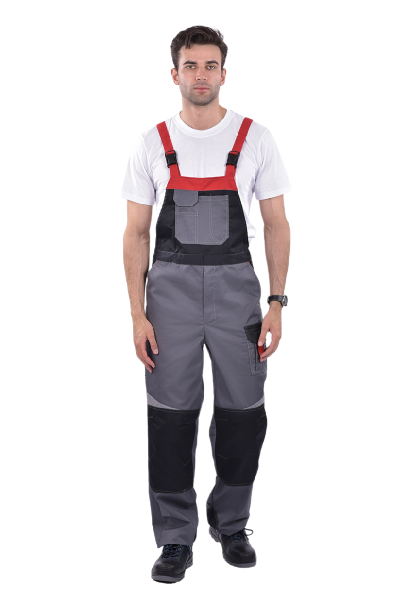 ➠ Полукомбинезон: в правом боковом шве застежка на пуговицу, в среднем шве на «молнию», карман с клапаном на грудке, боковые карманы с отрезным бочком. Колени усилены накладками, заложены по 2 вытачки. Один карман над левым наколенником. По шву наколенников косые, фигурные вставки СОП.
